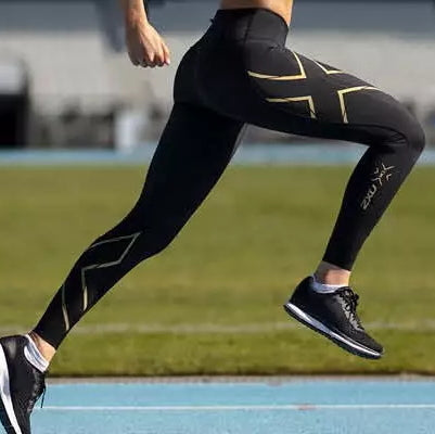 2XU Light Speed Mid-Rise Compression Tights, Damen, Laufhose, Black/Gold Reflective